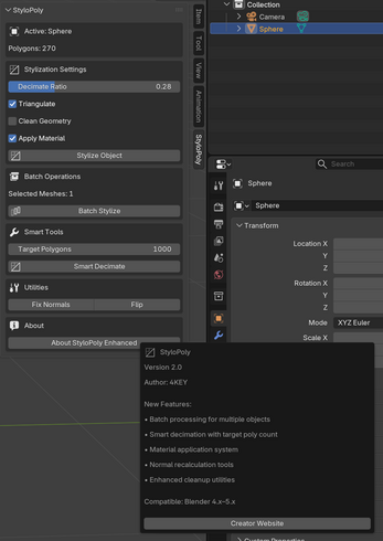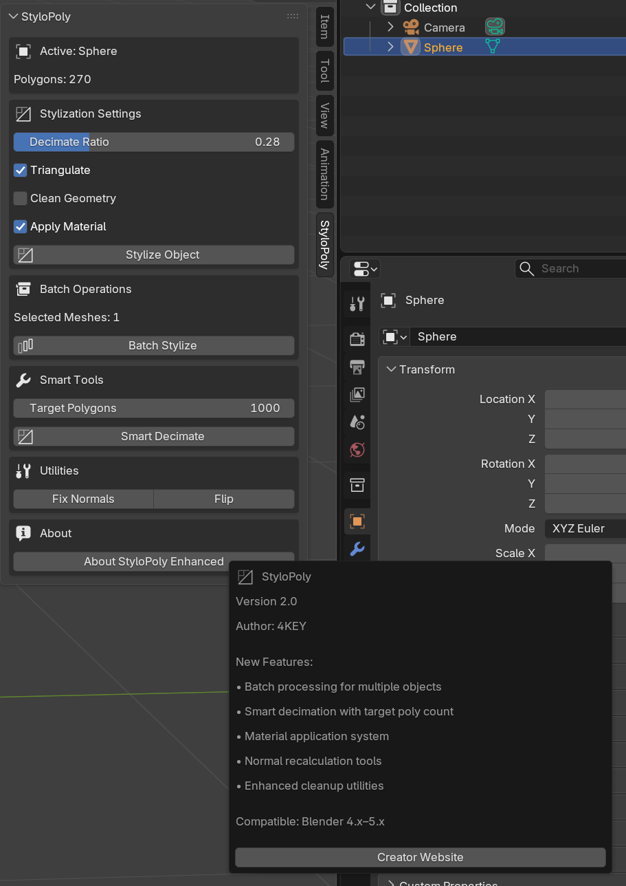 **StyloPoly** is an elegant and powerful Blender tool that instantly transforms your 3D models into stunning Low-Poly masterpieces. With intuitive controls for polygon reduction, triangulation, and geometry cleanup, it strikes a perfect balance between simplicity and quality. Create expressive, optimized models for games, animation, or art with ease!